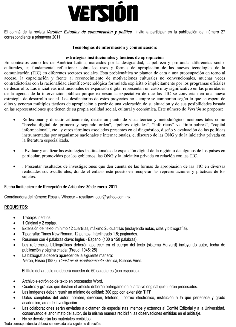 6099 México, revista Versión Estudios de comunicación y política, convocatoria