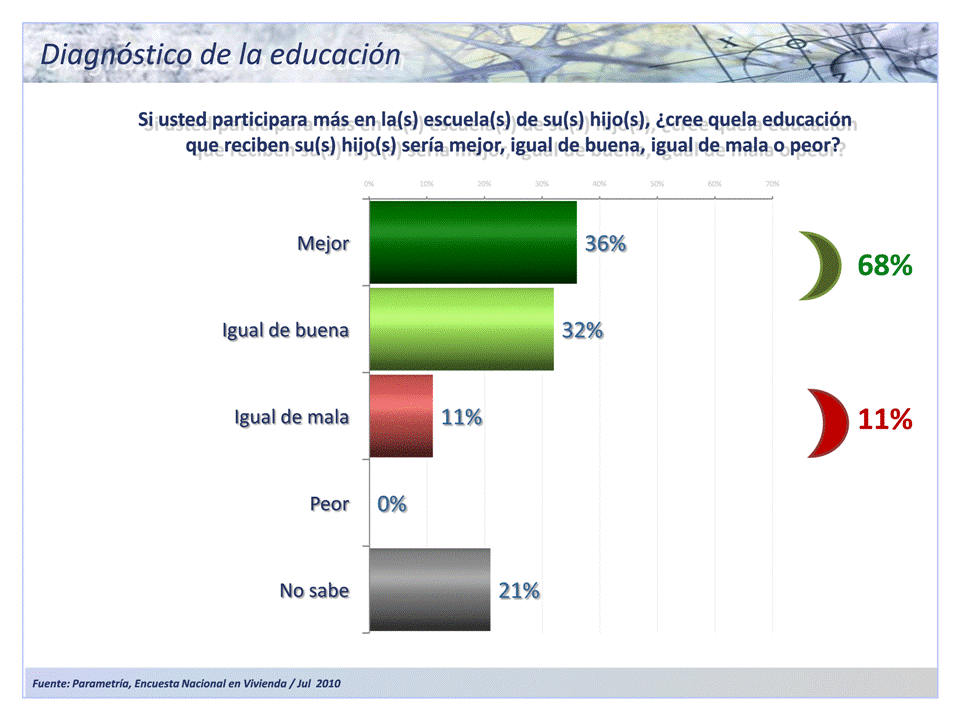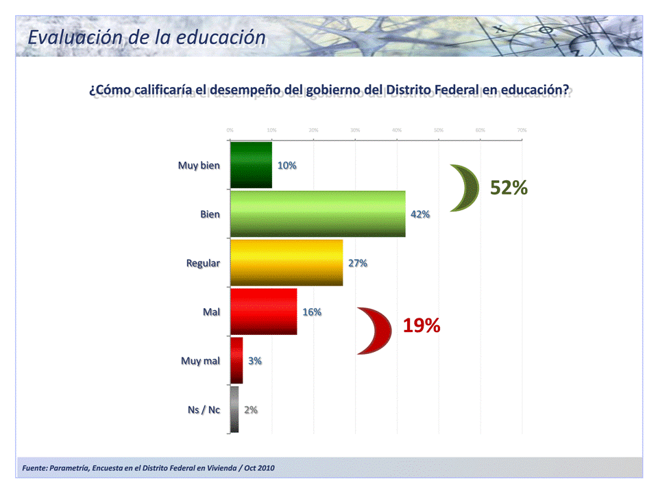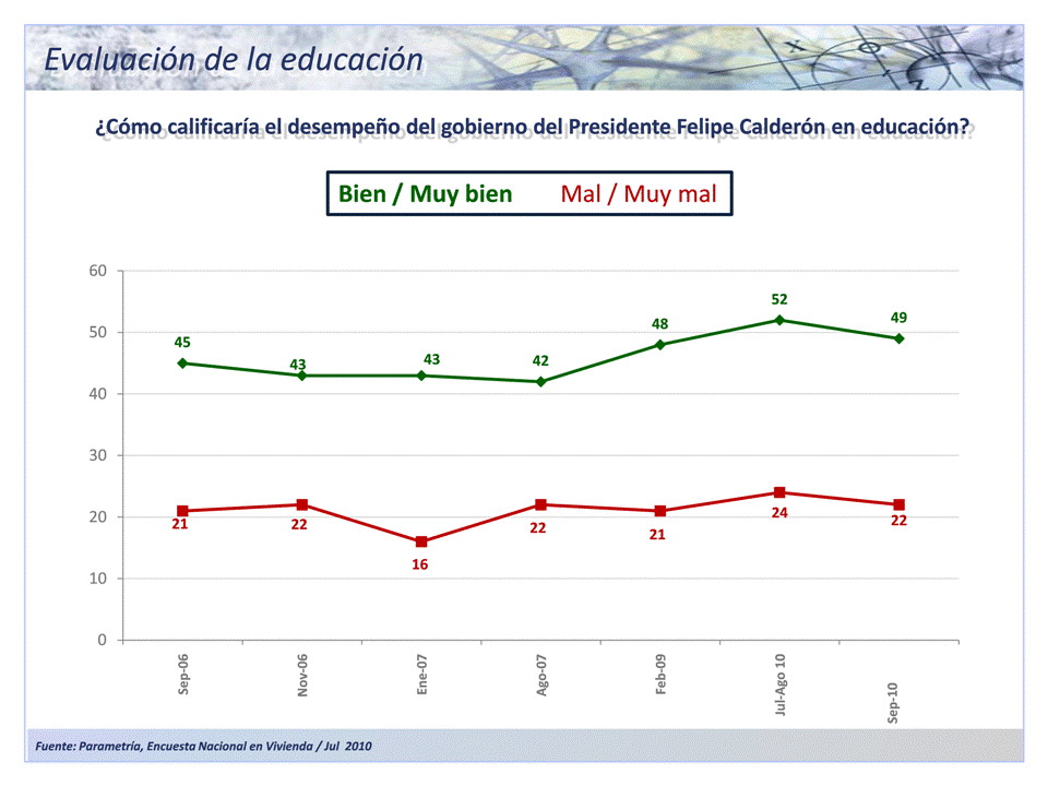 El trabajo del gobierno federal en educación es visto como bueno o muy bueno por la mitad de la población, 49%. Mientras que únicamente el 22% opina que el desempeño federal es malo o muy malo. Las mediciones de Parametría indican que, a lo largo del sexenio del Presidente Felipe Calderón la apreciación del desempeño en educación no ha bajado del 42% e incluso es uno de los rubros mejor calificados de la actual administración federal.