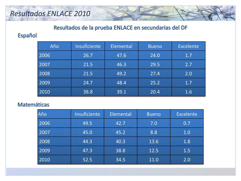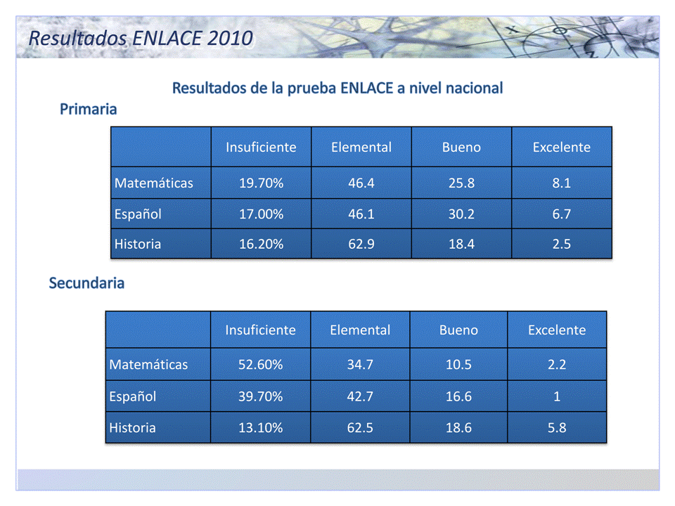 Los resultados de la Evaluación Nacional del Logro Académico en Centros Escolares (ENLACE) 2010 revelan que la mayor parte de los alumnos de primaria tienen un nivel elemental (apenas superior al insuficiente) en Matemáticas, Español e Historia. En tanto, la mayoría de los alumnos de secundaria, 53%, tiene un conocimiento insuficiente de Matemáticas; el 43% cuentan con un nivel elemental de Español y el 63% el mismo nivel en Historia.