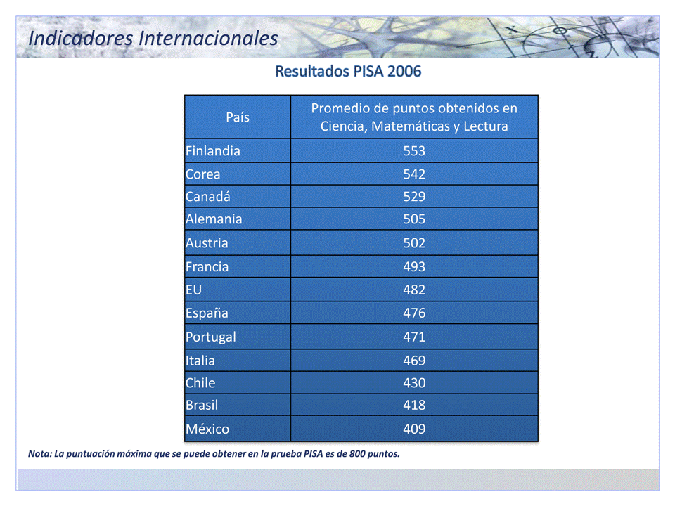 La prueba del Programa Internacional para la Evaluación de Estudiantes (PISA) revela también el bajo nivel de la educación en México. En los resultados de 2006 de PISA, estudio realizado por la Organización para la Cooperación y el Desarrollo Económico, México obtuvo en promedio 409 puntos, justo a la mitad del total que puede obtenerse.