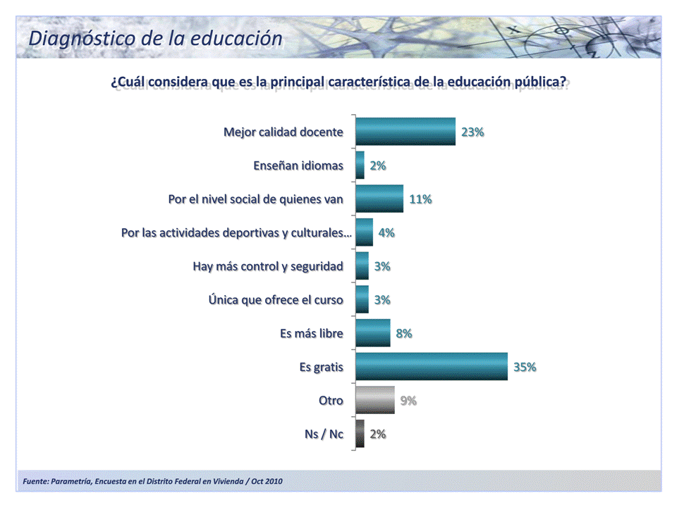 Aún con ello, el 35% de los habitantes del Distrito Federal cree que la educación pública es gratis, es decir, que no existe costo por ella. De esta concepción puede inferirse que los padres, por considerarla “gratuita” no exijan calidad.