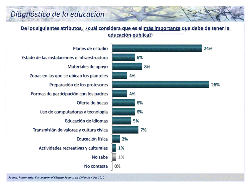 De hecho, la intervención de los padres en las actividades escolares no está considerada como un atributo importante de la educación. Son la preparación de los profesores y los planes de estudio los elementos más importantes que, de acuerdo con los encuestados, debe tener la educación pública.