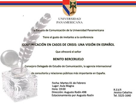 Compartimos contigo la invitación que nuestro amigo Carlos Bonilla, vicepresidente de ABCom, nos hacen llegar para participar en la Conferencia: Comunicación en casos de crisis, una visión en español, que ofrecerá el Sr. Benito Berceruelo, Consejero Delegado de Estudio de Comunicación en España. El evento no tiene costo y será el próximo martes 1 de febrero a las 19:00 horas en el Aula Magna de la Escuela de Comunicación de la Universidad Panamericana, ubicada en Augusto Rodin 498, Col. Insurgentes Mixcoac.