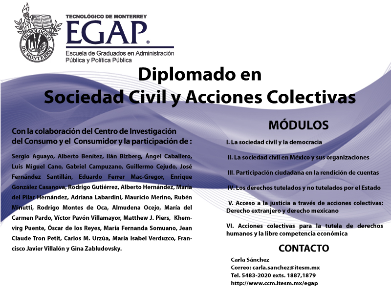 Anexo a la presente encontrarán una invitación (la cual reproduzco también abajo) y el temario de nuestro Diplomado en Sociedad Civil y Acciones Colectivas, el primero en México. Entre los ponentes se encuentran dos magistrados y un experto estadounidense en acciones colectivas (“class actions”). Espero les parezca lo suficientemente atractivo para tomarlo. Además, mucho les agradecería circularan este correo entre sus amistades potencialmente interesadas.