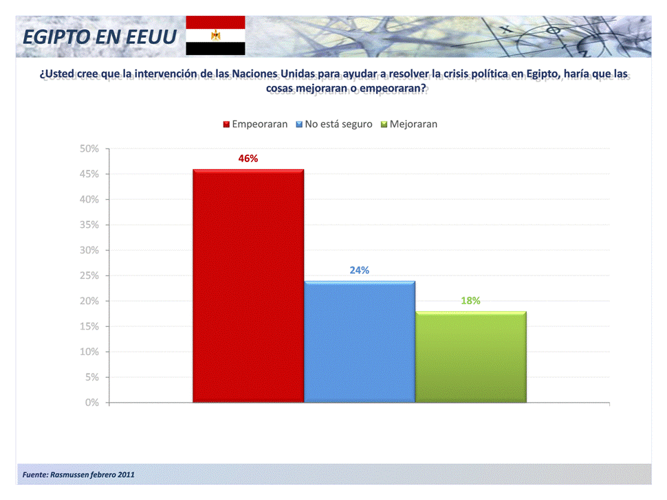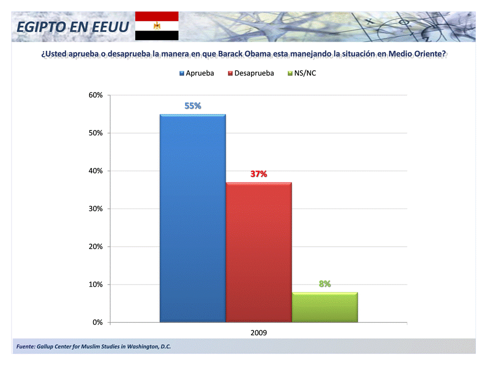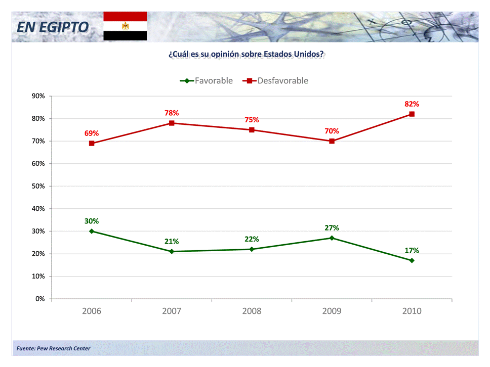 De acuerdo el Pew Research Center, entre 2009 y 2010 la imagen negativa de Estados Unidos ha crecido 12% entre los egipcios. La opinión favorable del país norteamericano cayó 10 puntos en tan solo 1 año, coincidente con la gestión de Barack Obama.