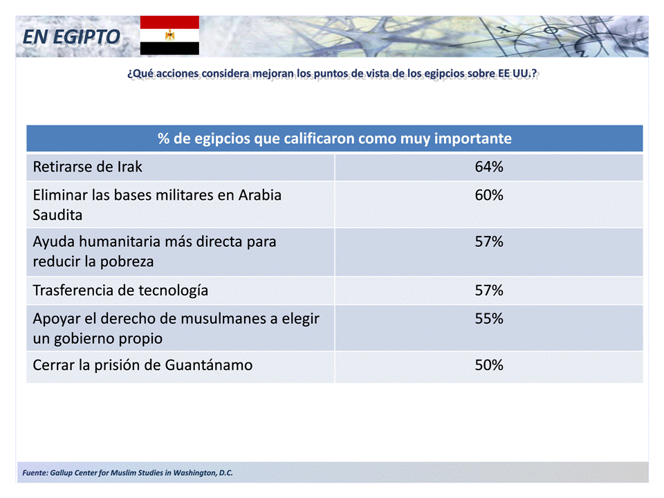 Para los egipcios la visión es otra, de inicio 64% cree que para que mejore la imagen de Estados Unidos es muy importante que se retiren las tropas estadounidenses de Irak. 60% cree como condición necesaria la eliminación de bases militares en Arabia Saudita. Llama la atención que el 55% de los egipcios manifestó, según los resultados de Gallup, que para mejorar la imagen de Estados Unidos era muy importante apoyar a los musulmanes para que pudieran elegir un gobierno propio.