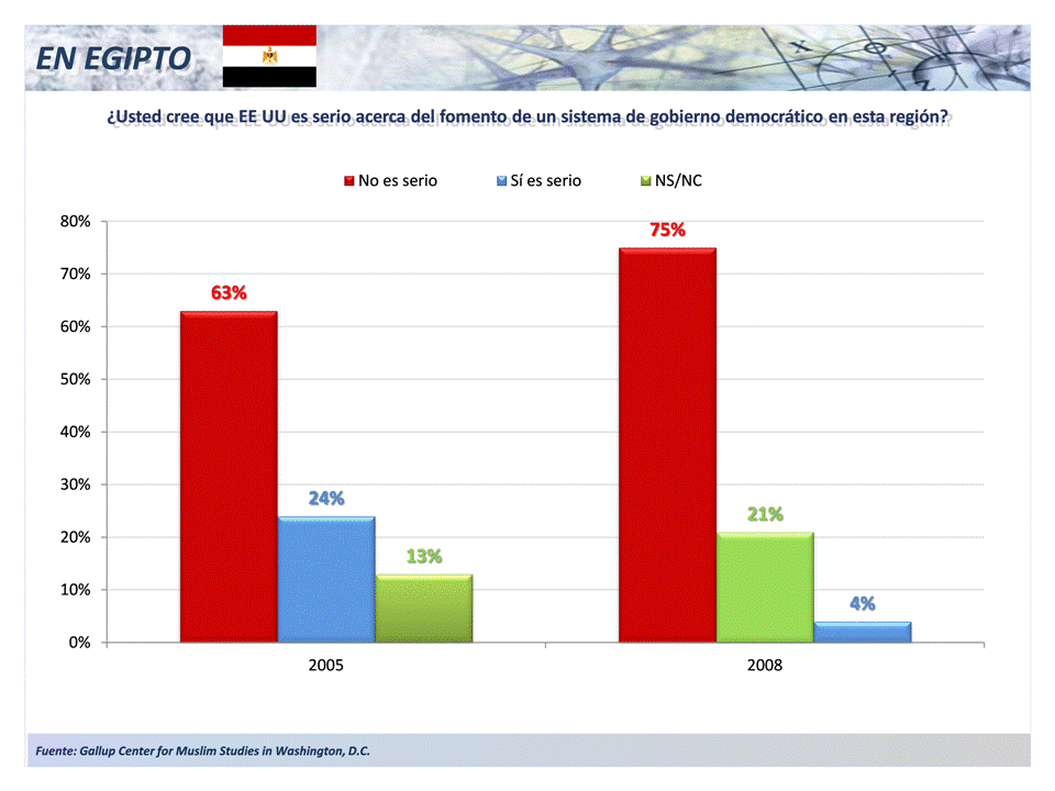 Este último hallazgo resulta de especial relevancia si se compara con lo declarado en 2008 por el 75% de los egipcios, quienes dudaron de la seriedad de Estados Unidos para fomentar el desarrollo democrático en el Medio Oriente. En sólo 3 años aumentó en 12 puntos el desacuerdo en el empeño de la nación norteamericana para impulsar la democracia. Para 2008 apenas el 4% de los egipcios creía en la intención estadounidense.