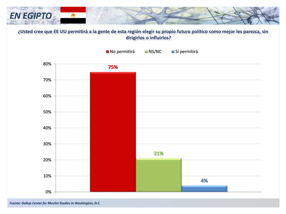 Incluso, los egipcios se muestran reservados sobre la influencia que Estados Unidos pudiera tener en el conducto de sus decisiones. Antes de la dimisión de Mubarak, el 75% pensaba que Estados Unidos no los dejaría elegir su futuro político sin que intentara influirlo o dirigirlo.