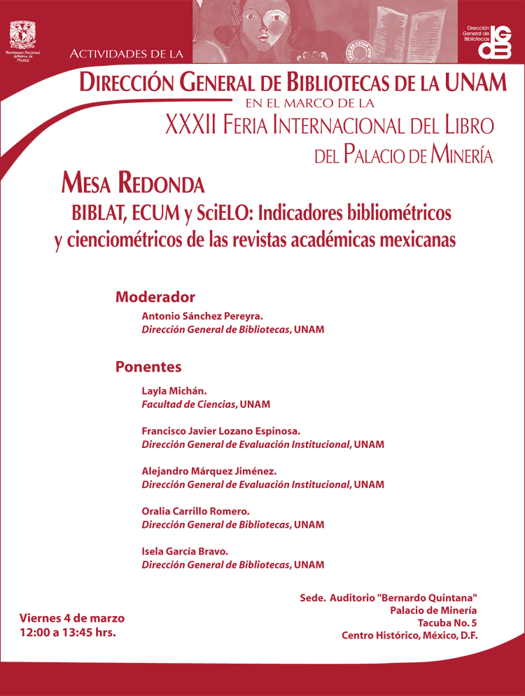 Objetivo: Dar a conocer a los editores de revistas e interesados en esta temática, los nuevos desarrollos enfocados en la generación de indicadores bibliométricos y cienciométricos a partir de la información publicada en las revistas académicas mexicanas indizadas en CLASE, PERIÓDICA y SciELO-México. Para tal efecto, se expondrán las características y funcionalidad de BIBLAT, el Estudio Comparativo de Universidades Mexicanas (ECUM) y SciELO-México. Por otra parte, Layla Michán, especialista en bibliometría, expondrá el significado y relevancia de los indicadores bibliométricos. El objetivo general del evento es refrendar la importancia de la vinculación entre editores y los sistemas de indización, así como la corresponsabilidad de ambos actores en la comunicación científica y la representación de la ciencia nacional a través de indicadores métricos.