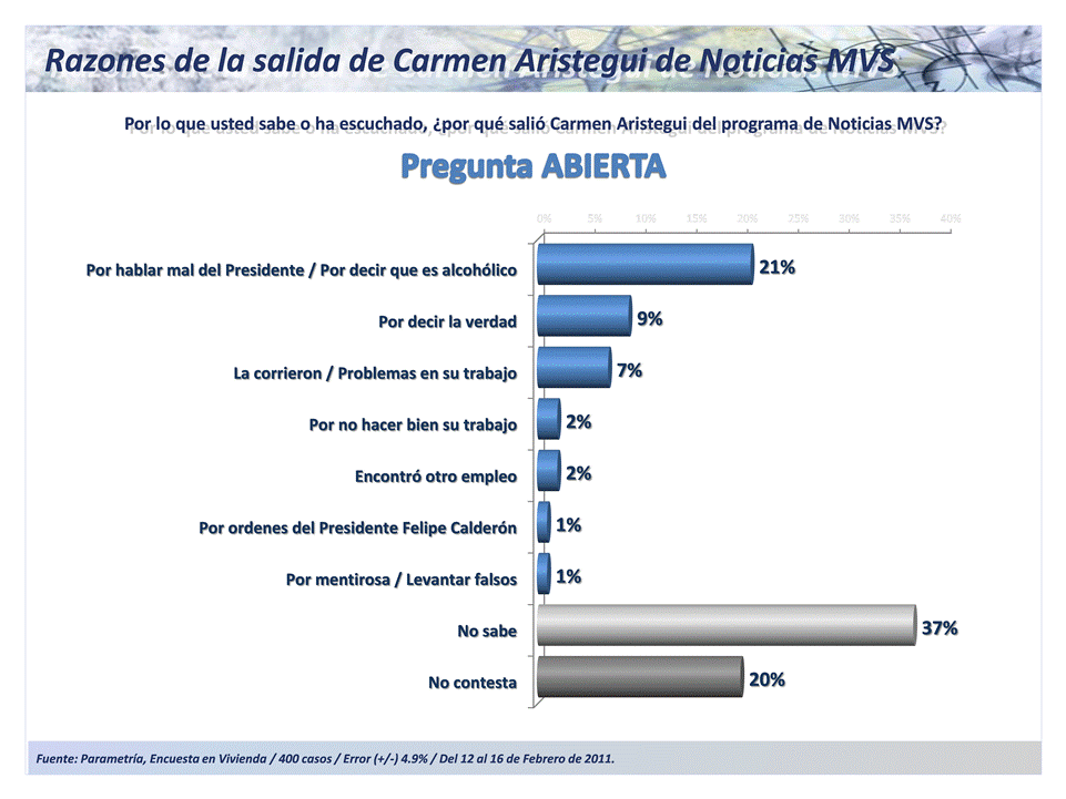 Apenas un 9% considera que el despido fue por decir la verdad. Llama la atención que únicamente el 1% achaca la salida de Aristegui a las órdenes del Presidente Calderón, de cuya oficina, según la periodista, habría salido la exigencia de cancelar su programa.