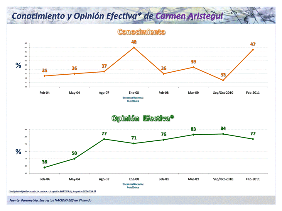PARAMETRÍA. Estudio: Encuesta Nacional en vivienda. Representatividad: Nacional. Número de entrevistas: 400 encuestas del 12 al 16 de febrero de 2011. Nivel de confianza estadística: 95%. Margen de error (+/-) 4.9%. Diseño, muestreo y análisis: Parametría SA de CV. Operativo de Campo: Lumich Consultores. Método de muestreo: Aleatorio sistemático con probabilidad proporcional al tamaño. Unidad de muestreo: Las secciones electorales reportadas por el IFE.