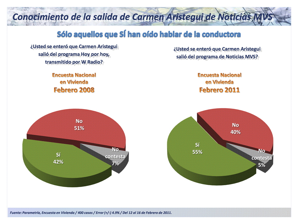 Entre quienes conocen a la periodista, el despido de MVS tuvo un eco importante, pues seis de cada diez se enteraron de la salida. Comparado con 2008, cuando dejó de estar al aire el programa de la periodista en W Radio, creció en 13 puntos el nivel de conocimiento del evento del 7 de febrero pasado, cuando MVS Radio dio a conocer, a través de un comunicado, la salida de la periodista de la conducción del programa matutino de noticias, por una transgresión al código de ética de la empresa.