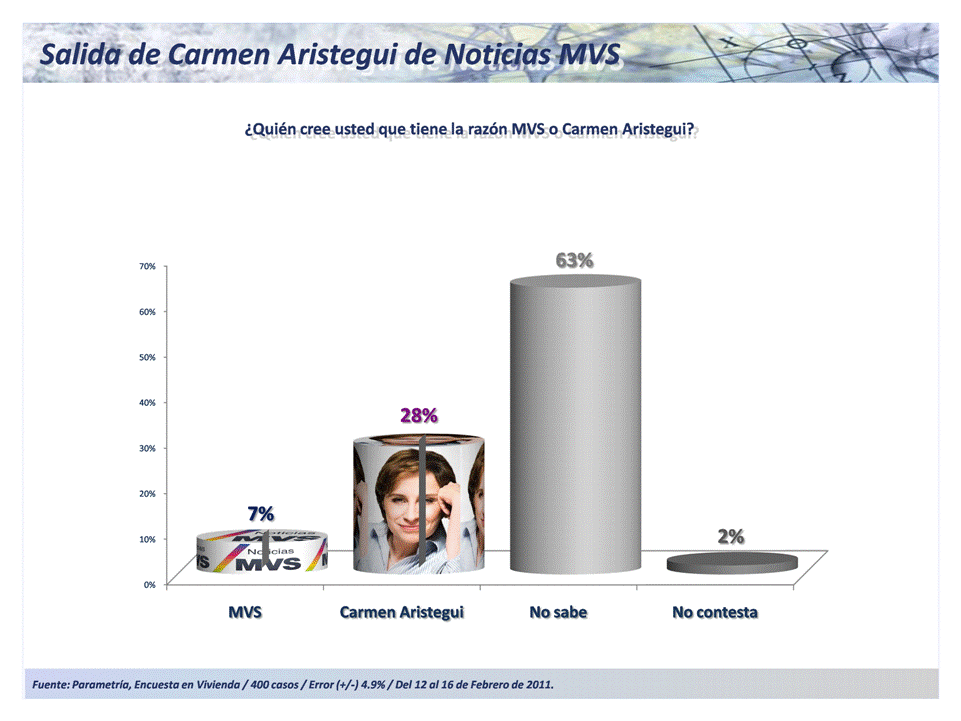 Ante el conflicto, el 63%, no sabe quién tenía la razón. En tanto el 28% dice que Aristegui tiene la razón, y el 7% que MVS, empresa que permitió el regreso de la periodista al programa de noticias, el 21 de febrero pasado.