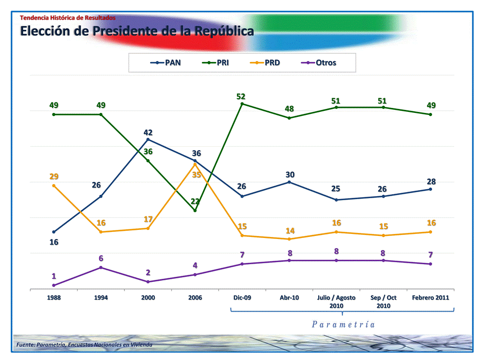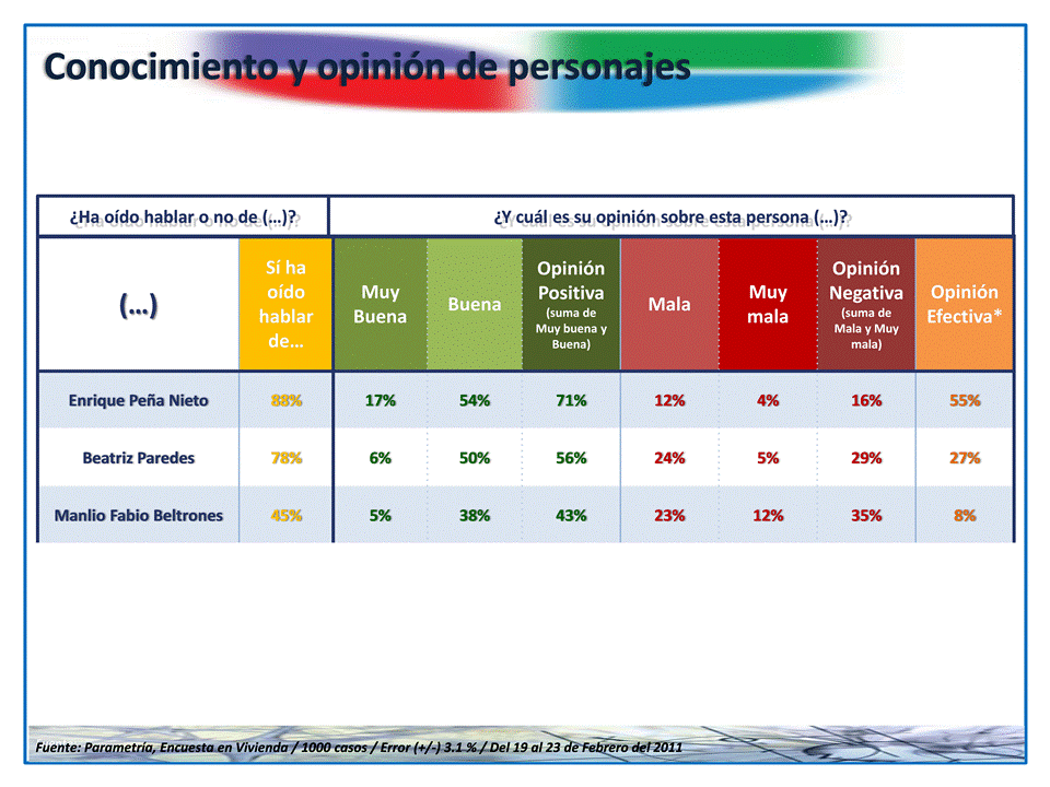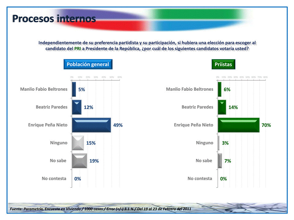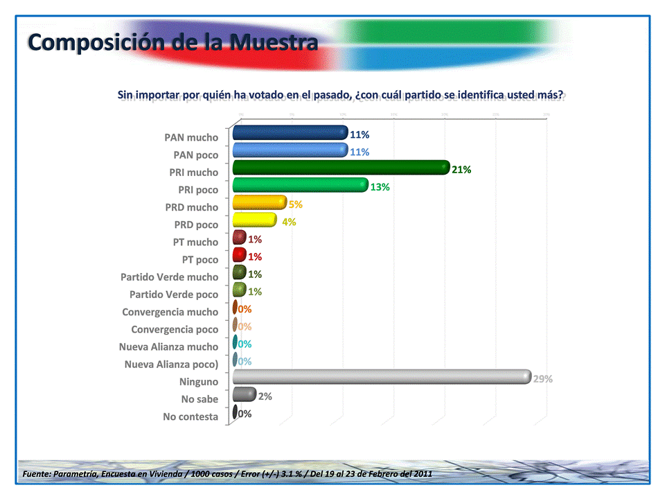 PARAMETRÍA-Univision Estudio: Encuesta Nacional en vivienda. Representatividad: Nacional. Número de entrevistas: 1000 encuestas del 19 al 23 de febrero de 2011. Nivel de confianza estadística: 95%. Margen de error (+/-) 3.1%. Diseño, muestreo, levantamiento de campo y análisis: Parametría SA de CV.. Método de muestreo: Aleatorio sistemático con probabilidad proporcional al tamaño. Unidad de muestreo: Las secciones electorales reportadas por el IFE.