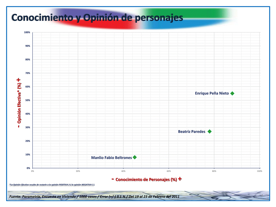 En primer lugar está el Gobernador del Estado de México, Enrique Peña Nieto, que tiene un nivel de conocimiento de 88% entre los ciudadanos y con una opinión efectiva (saldo de la opinión positiva menos la negativa) de 55%.Le sigue Beatriz Paredes, diputada y ex presidenta nacional del PRI, con 78% de conocimiento y 27% de opinión efectiva. Por último está el senador Manlio Fabio Beltrones, quien públicamente ha aceptado su aspiración a la Presidencia, con 45% de conocimiento entre la ciudadanía, aunque con una opinión efectiva de 8%.