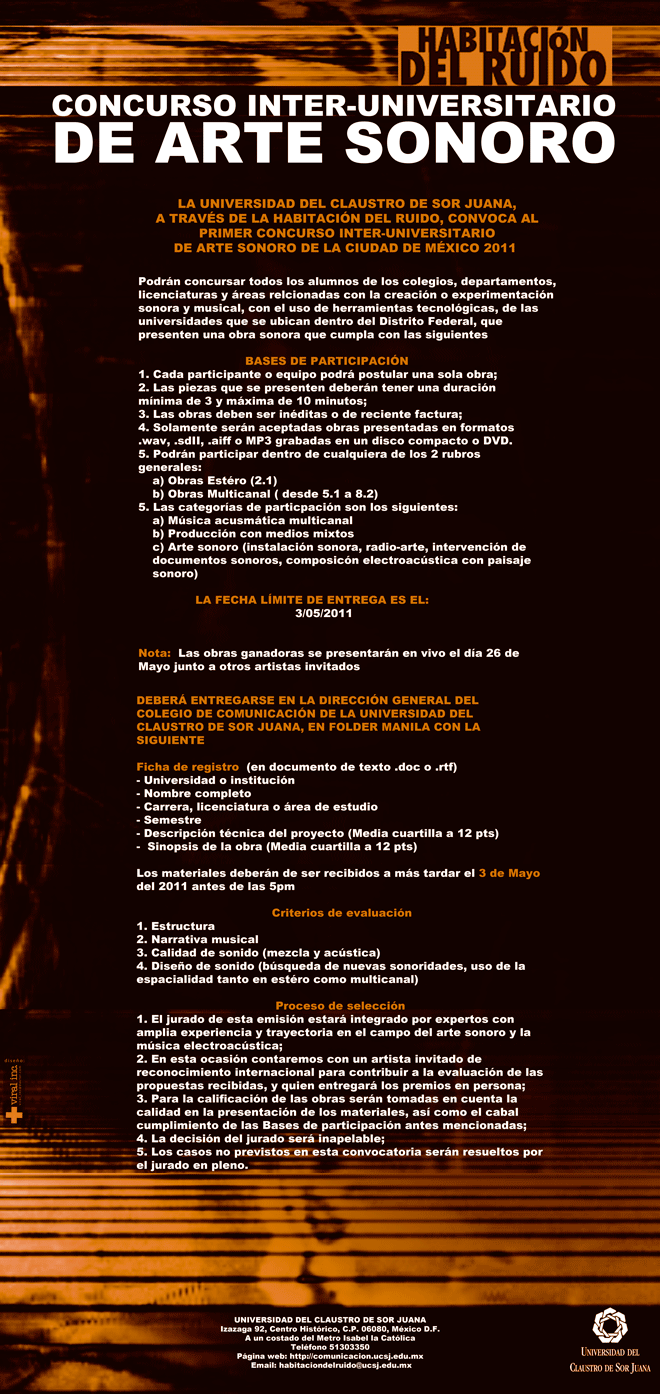 LA UNIVERSIDAD DEL CLAUSTRO DE SOR JUANA, A TRAVÉS DEL COLEGIO DE COMUNICACIÓN, COMO PARTE DE LAS ACTIVIDADES DE LA HABITACIÓN DEL RUIDO, CONVOCA AL PRIMER CONCURSO INTER-UNIVERSITARIO DE ARTE SONORO DE LA CIUDAD DE MÉXICO 2011