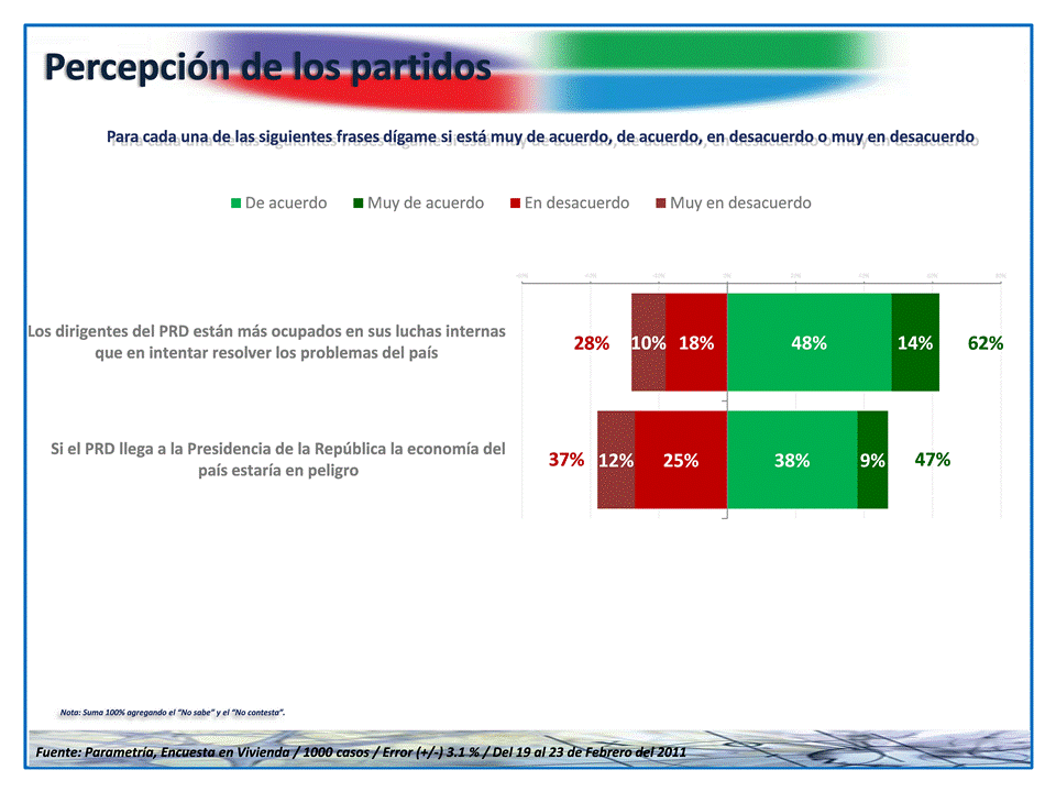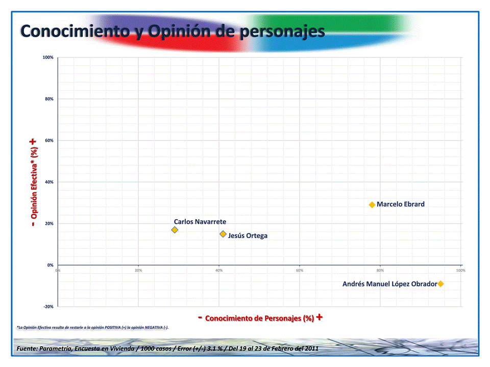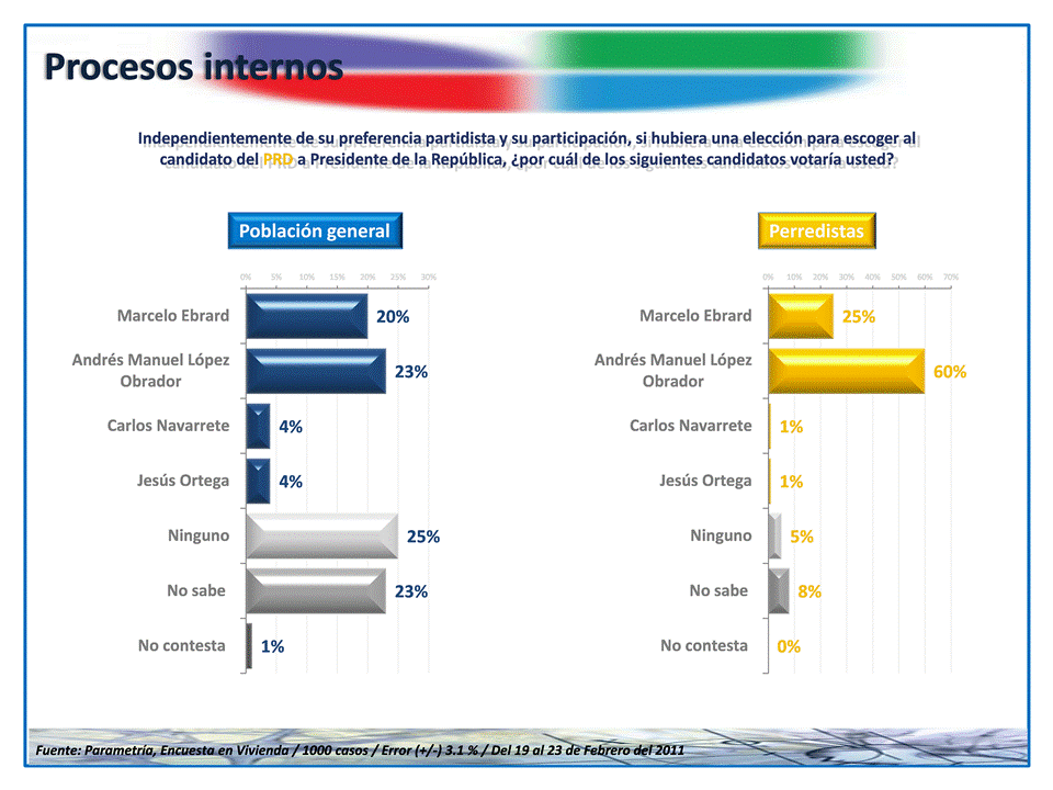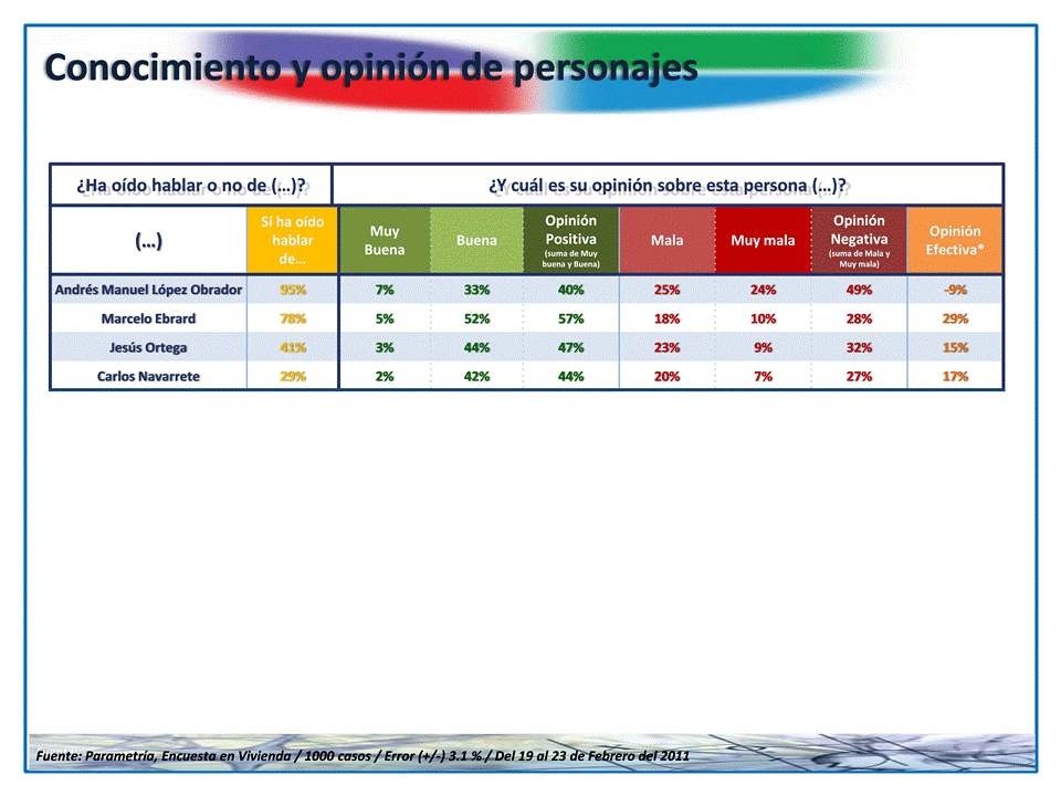 PARAMETRÍA-Univision Estudio: Encuesta Nacional en vivienda. Representatividad: Nacional. Número de entrevistas: 1000 encuestas del 19 al 23 de febrero de 2011. Nivel de confianza estadística: 95%. Margen de error (+/-) 3.1%. Diseño, muestreo, levantamiento de campo y análisis: Parametría SA de CV.. Método de muestreo: Aleatorio sistemático con probabilidad proporcional al tamaño. Unidad de muestreo: Las secciones electorales reportadas por el IFE.