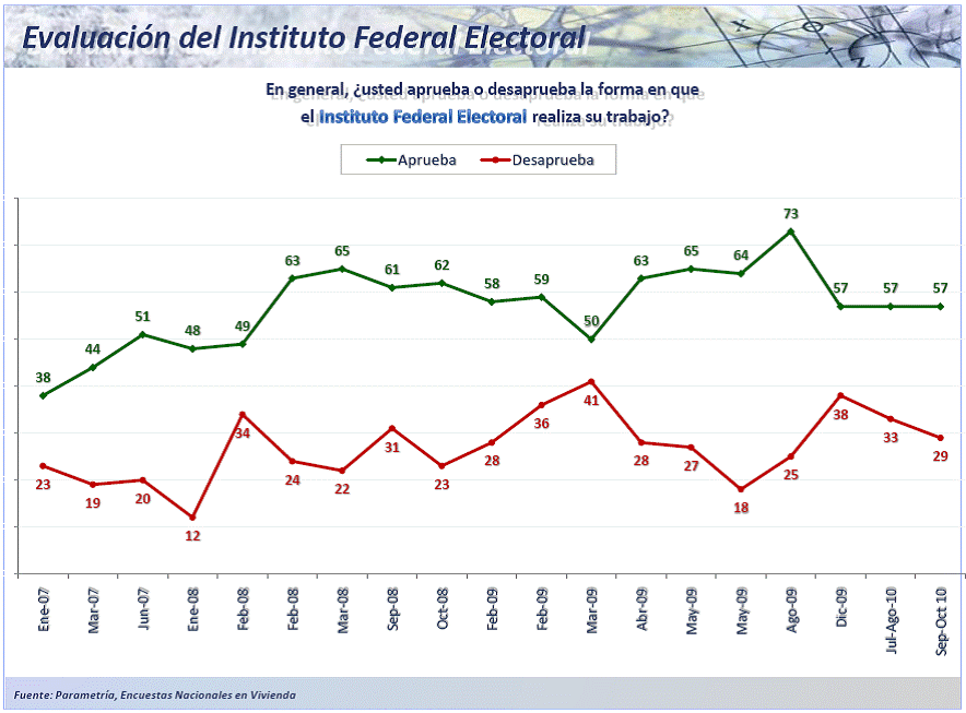 Cabe resaltar que, aunque no está en su mejor momento, la aprobación ciudadana al IFE se ha recuperado significativamente si se observa el 38% de aprobación de enero del 2007.