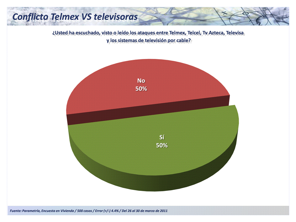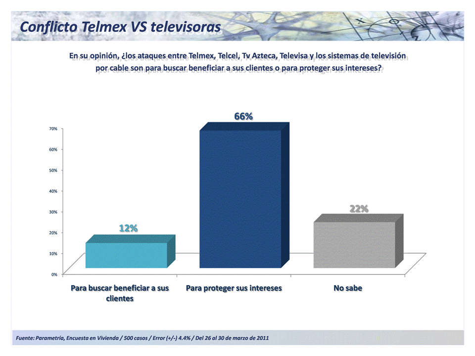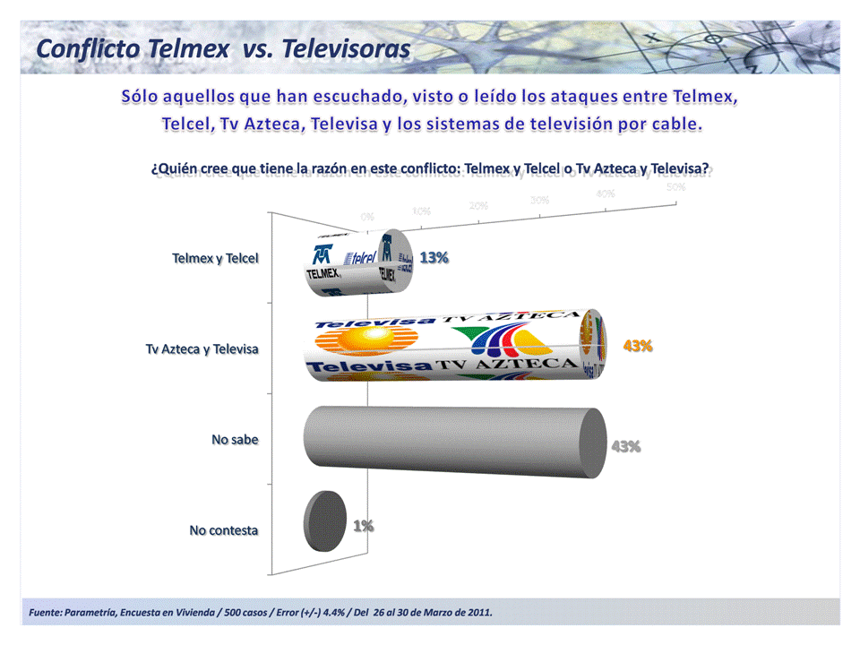 El 43% de los encuestados considera que la razón está del lado de las televisoras, las que, junto a 25 operadores de cableras, denunciaron a Telmex y Telcel ante la Comisión Federal de Competencia fijación de precios altos por interconexión. El 13% opina que son Telcel y Telmex los que tienen la razón, mientras que un 43% no sabe.