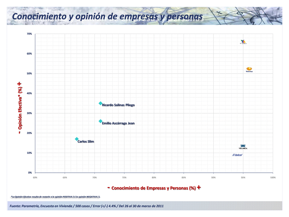 Aunque los números no son tan positivos en cuanto a la opinión que se tiene de ellas. En primer lugar de opinión efectiva (saldo de opinión positiva menos negativa) está Tv Azteca con 66%, le sigue Televisa con 52%. Las empresas de telefonía tienen un saldo apenas positivo, de 13% Telmex y de 9% Telcel, ambas controladas por el magnate mexicano Carlos Slim,