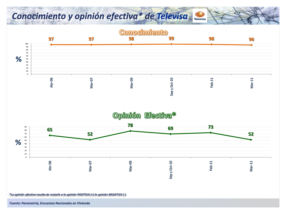 En marzo de 2007, Televisa llegó a su punto mínimo de opinión efectiva, con 52%, mismo porcentaje que obtiene en la medición actual. El nivel máximo de opinión es de 78%.