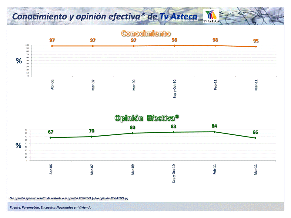 Para Tv Azteca la opinión efectiva actual es de 66% (la mínima en la serie), la más alta fue en febrero de 2011, con el 84%.