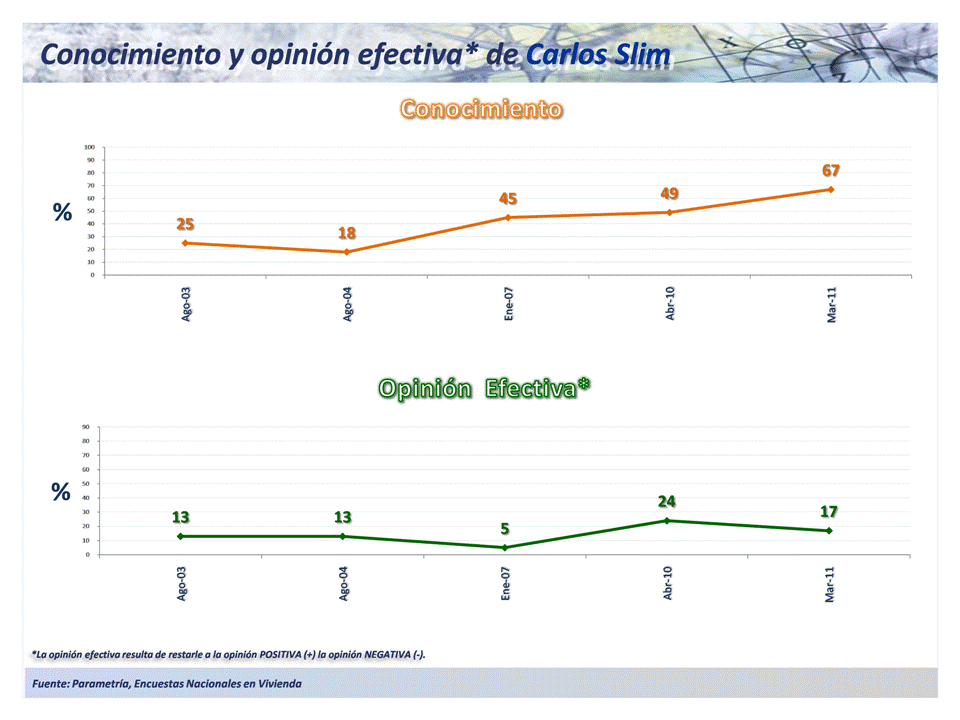 PARAMETRÍA. Estudio: Encuesta Nacional en vivienda. Representatividad: Nacional. Número de entrevistas: 500 encuestas del 26 al 30 de marzo de 2011. Nivel de confianza estadística: 95%. Margen de error (+/-) 4.4%. Diseño, muestreo, operativo de campo y análisis: Parametría SA de CV. Método de muestreo: Aleatorio sistemático con probabilidad proporcional al tamaño.Unidad de muestreo: Las secciones electorales reportadas por el IFE.