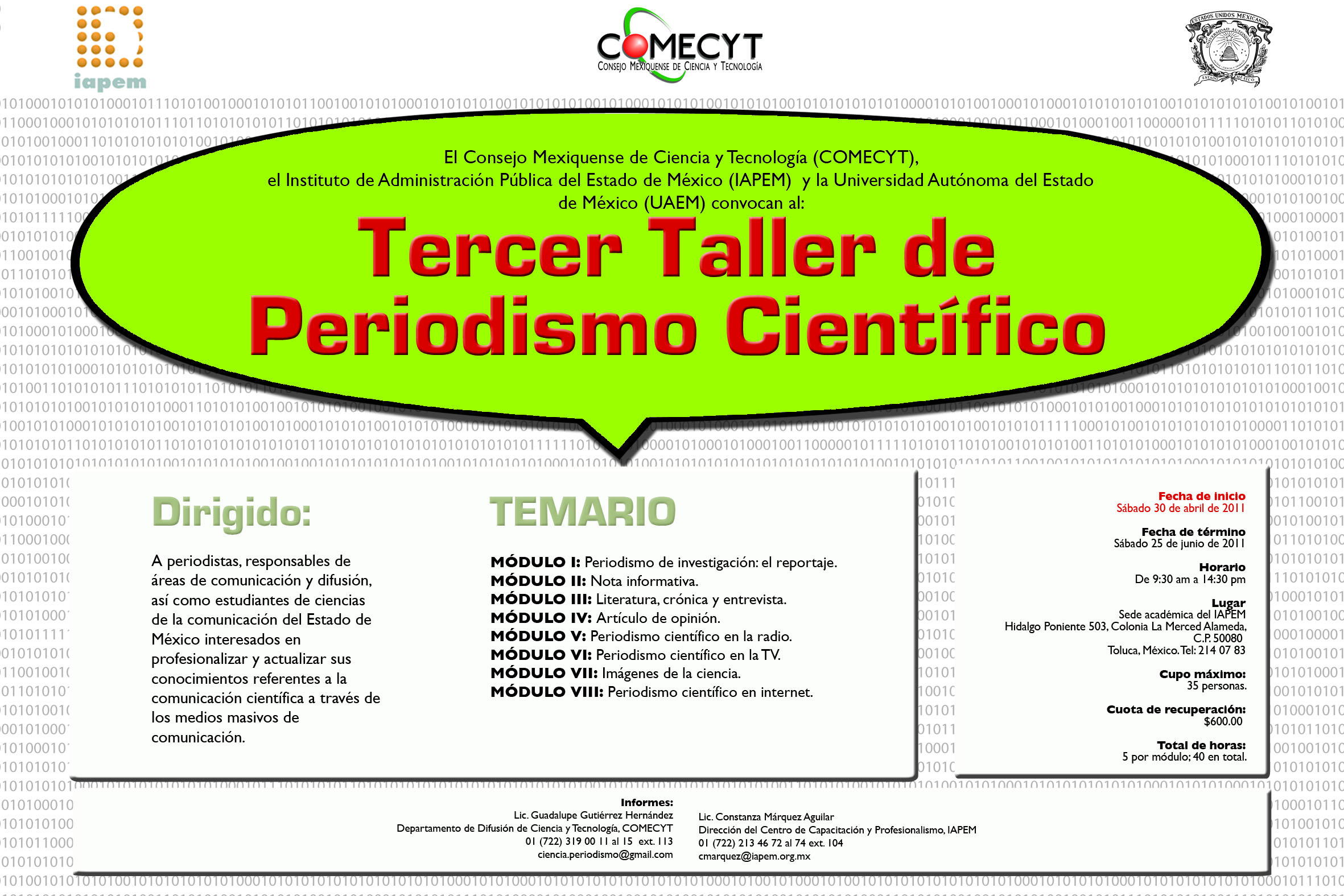 El Consejo Mexiquense de Ciencia y Tecnología (COMECYT) se complace en invitarlos a su Tercer Taller de Periodismo Científico que dará inicio el 30 de abril en el centro de Toluca.