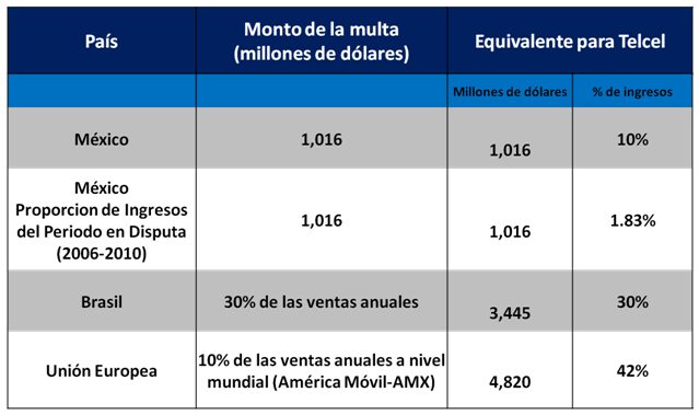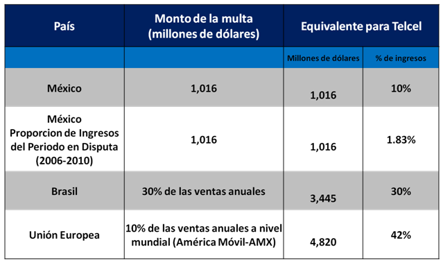 En primer lugar, el monto de la multa corresponde aproximadamente al 10% de los ingresos de Telcel durante 2010. Al comparar este resultado con otras disposiciones a nivel internacional observamos que en países de la Unión Europea la multa determinada por la Comisión Europea por este tipo de prácticas asciende al 10% de las ventas anuales a nivel mundial! de la empresa. Y suponiendo este tipo de sanción para Telcel, el monto de la multa correspondería al 10% de las ventas anuales de América Móvil a nivel mundial, acumulando un total de 60,790 millones de pesos, cinco veces más que el monto impuesto por la CFC.