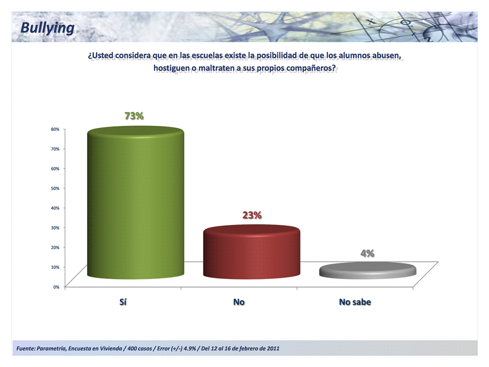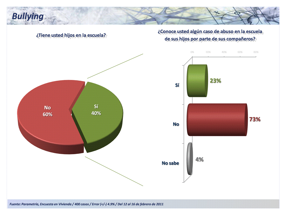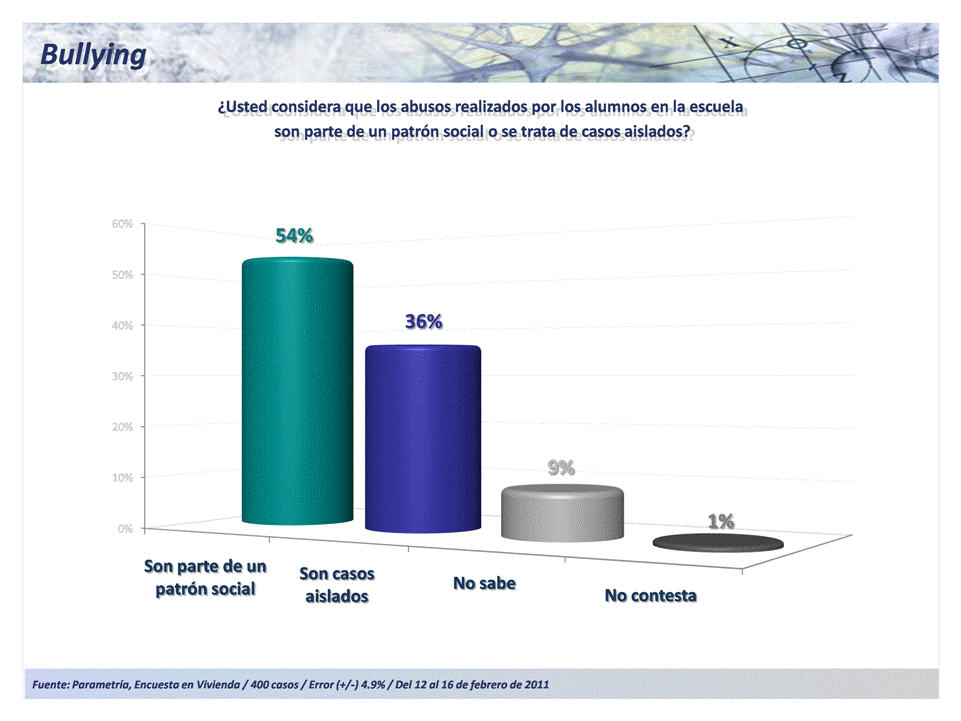 La Encuesta Nacional en Vivienda de Parametría de febrero refleja datos contrastantes, pues mientras autoridades escolares e instituciones de derechos humanos han levantado la voz para alertar sobre el crecimiento del bullying y las consecuencias de éste, para los padres de familia no se trata aún de un fenómeno considerable en magnitud.