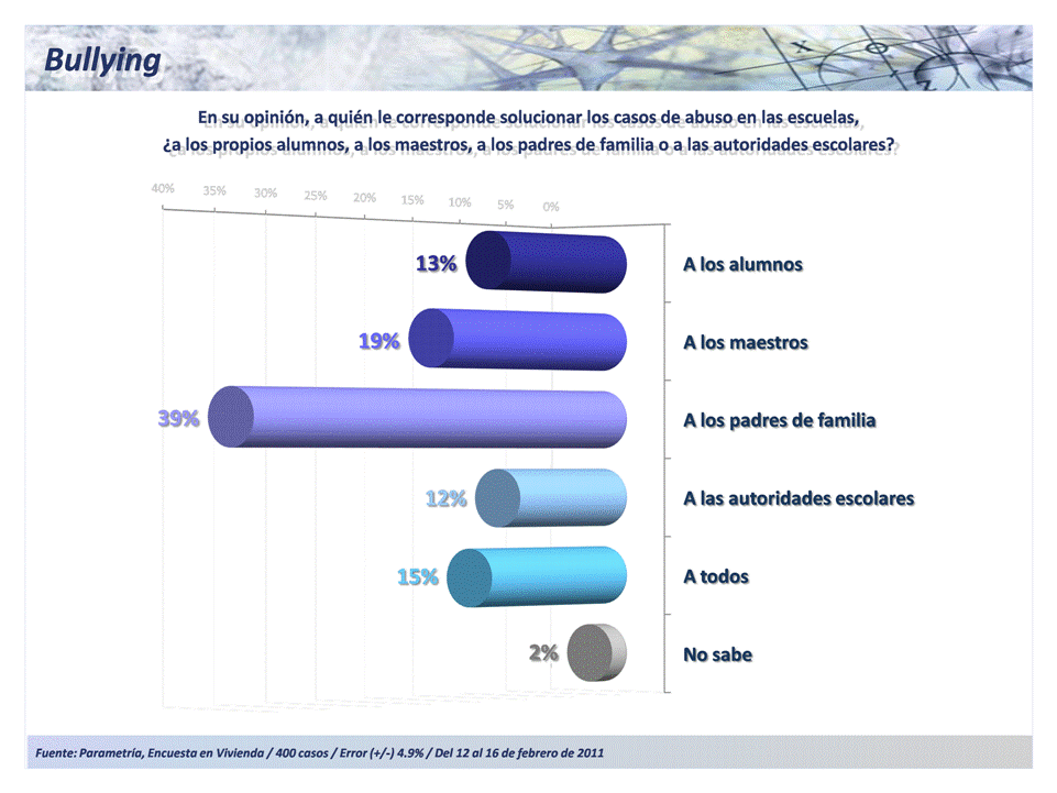 Destaca que, aún cuando no conocen los casos, son los padres los que aparecen con mayor número de menciones como los responsables de solucionar los casos de bullying con 39%. En segundo lugar quedaron los maestros con 19%, le siguen los alumnos con 13% y por último las autoridades escolares con 12%. Un escaso 15% opina que es responsabilidad de todos solucionar los casos de abuso.