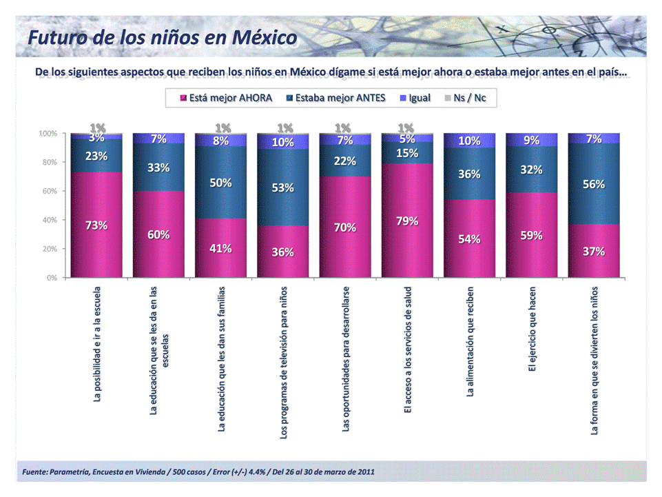 Así, resulta interesante evaluar cómo ven los mexicanos el panorama de los niños de hoy. De acuerdo con los resultados, los mexicanos creen que en la mayor parte de los rubros, está mejor ahora la situación de la infancia.