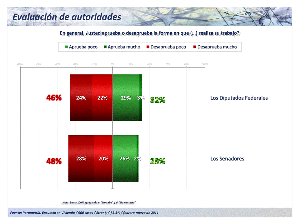 Para el periodo de febrero-marzo de 2011, los diputados sumaban 32% de aprobación y 46% de desaprobación, frente a 28% y 48%, respectivamente, de los senadores.