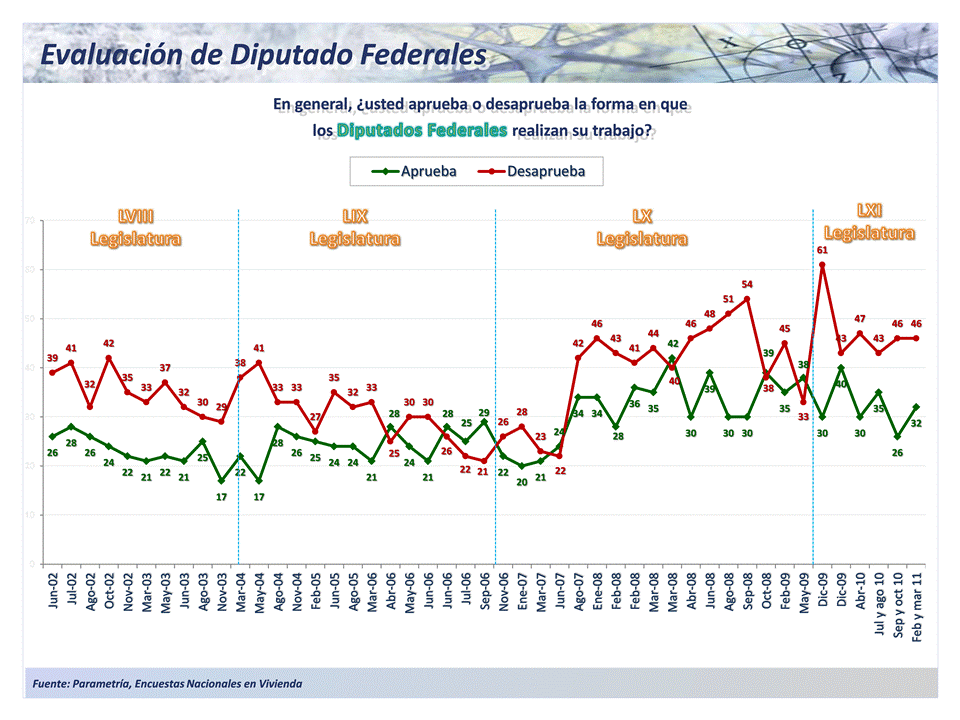 Se aprecia también que la LXI Legislatura, iniciada en septiembre de 2009, ha logrado disminuir sus índices de desaprobación, aunque se encuentra todavía lejos de los números logrados por los representantes de legislaturas anteriores.
