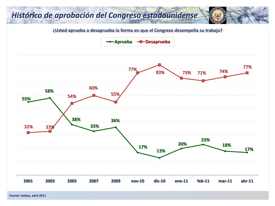 De acuerdo con una encuesta de Gallup, ocho de cada diez estadounidenses desaprueban el trabajo de su Congreso. Únicamente el 17% de los encuestados aprobó el trabajo de los legisladores del país vecino.