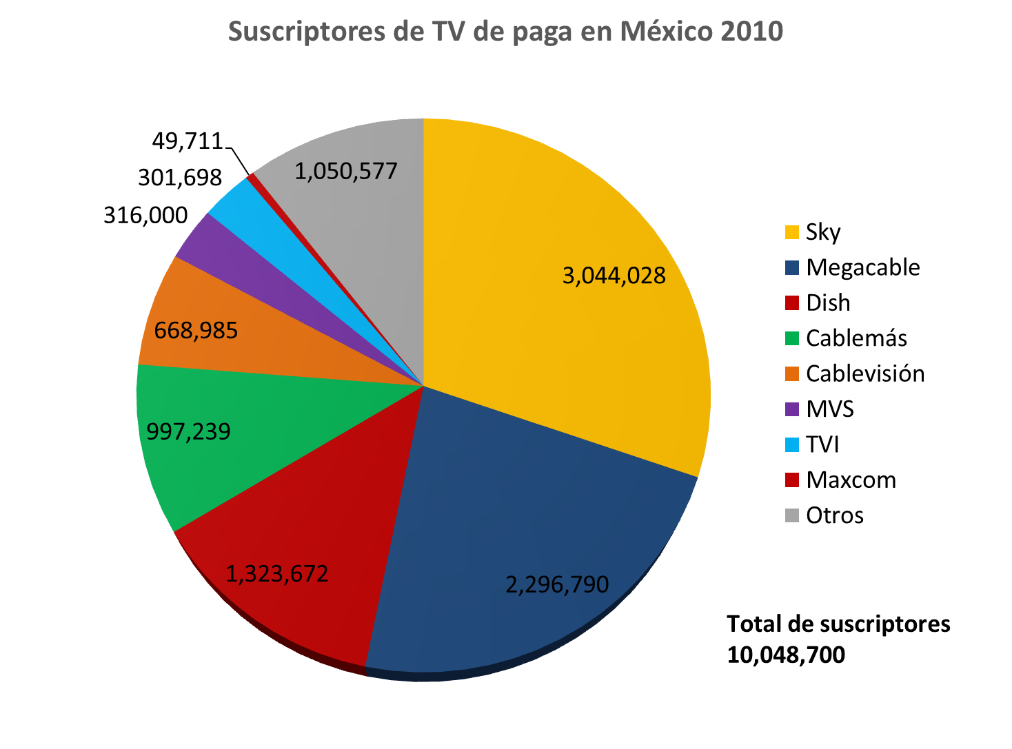 A finales de diciembre de 2010 existían 632 concesionarios de televisión y audio restringidos que acaparan 3 mil 610 concesiones para prestar el servicio. La industria está concentrada en cuatro grupos principales: Televisa (Cablevisión, TVI y Cablemás), Megacable, Grupo Hevi y Cablecom. En total Televisa, Megacable y Grupo Hevi concentran 73.3 por ciento del mercado de televisión por cable. Si sumamos a Sky, resulta que ellos acaparan 67 por ciento de todo el mercado de la televisión de paga (cable y satelital).