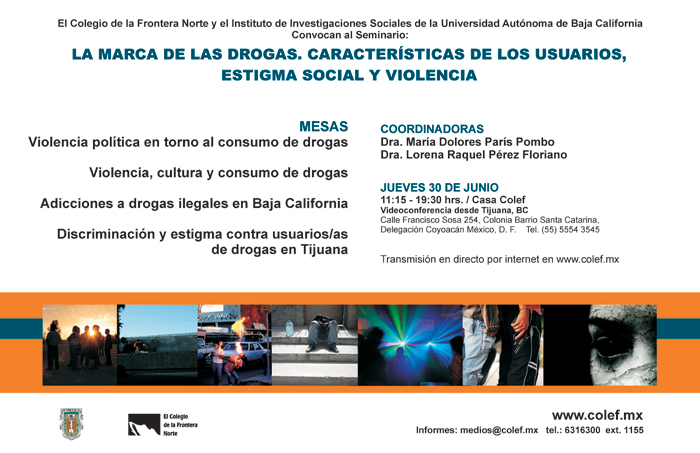 El Colegio de la Frontera Norte y la Universidad Autónoma de Baja California invitan al seminario: La marca de las drogas. Características de los usuarios, estigma social y violencia, el jueves 30 de junio a las 9:00 horas, tiempo del pacífico, en el aula magna Raúl Rangel de El Colef, Tijuana.