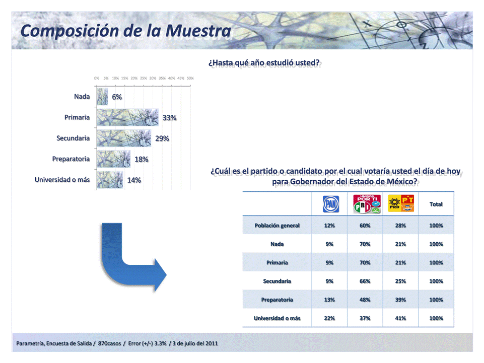 El ejercicio de exit poll, en este caso el realizado por Parametría, sirve más que para dar estimaciones sobre el ganador, para examinar al electorado y explorar las razones de su voto. Los resultados del estudio permiten ver que fueron los jóvenes, las mujeres y los sectores de ingreso bajo los que dieron la victoria al PRI.