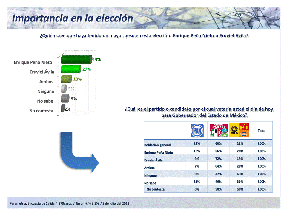 Aquí existe dos datos que aportan luz para el análisis, 44% de los votantes que vieron mayor peso de Peña Nieto en la elección votaron por la oposición (28% por el PRD y 16% por el PAN). Y mientras el público en general cree que el político de más peso en la elección fue Peña Nieto, los que votaron por el PRI piensan que fue Eruviel Ávila.