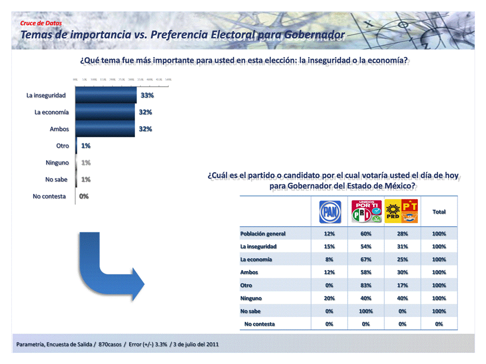 Para los electores mexiquenses, los temas más importantes en la elección fueron la inseguridad y la economía. Quienes se preocuparon más por la inseguridad dieron menos votos al PRI que aquellos que consideraron más importante la economía (54% frente a 67%). El dato más relevante sea quizá que el PAN obtuvo únicamente 15% de votos de aquellos electores que creyeron más importante la inseguridad, es decir, la bandera de política pública del actual gobierno federal –la lucha contra la inseguridad- no fue elemento suficiente para que el blanquiazul obtuviese más votos ni siquiera entre los que ven en la falta de seguridad el tema más importante para la entidad.