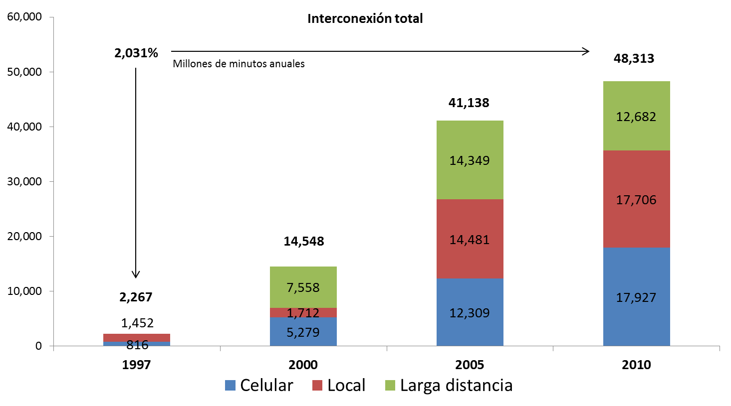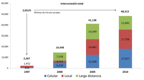 Por cierto, el tráfico local que se ofrece bajo el esquema Bill and Keep registra los mayores volúmenes, lo que refleja competencia en el mercado. El tráfico de interconexión se ha multiplicado miles de veces, lo que significa que Telmex no ha frenado el impulso de las empresas competidoras. Los millones de minutos anuales de interconexión bajo el modelo Bill and Keep se han incrementado más de 2 mil por ciento en 13 años, lo que habla del crecimiento de las demás redes.