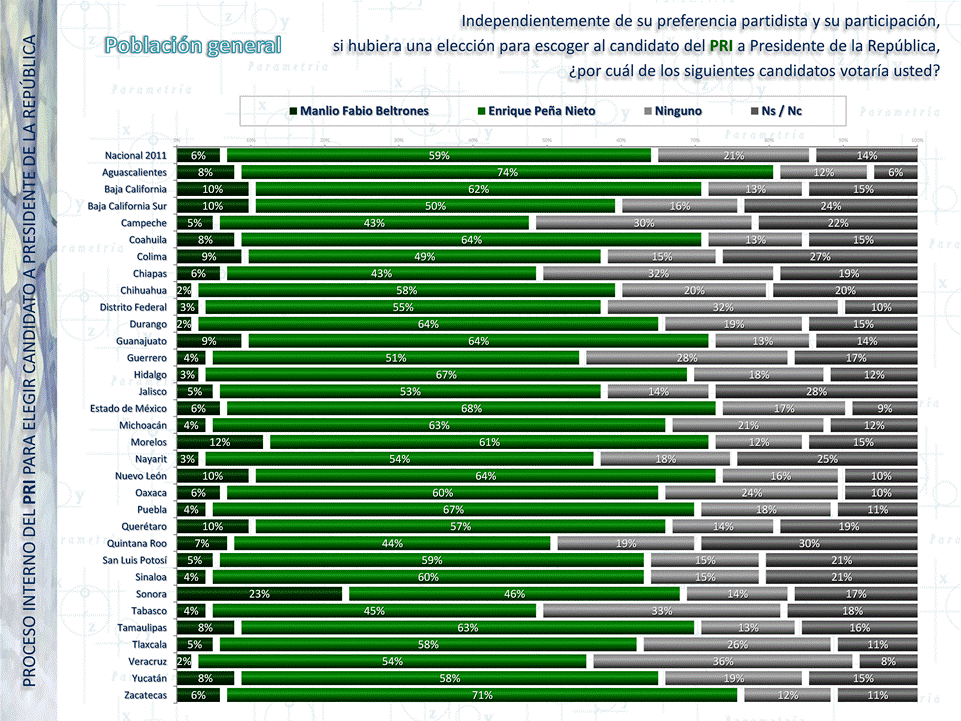 Seis de cada 10 mexicanos elegirían a Enrique Peña Nieto como el candidato del PRI a la Presidencia de la República sobre Manlio Fabio Beltrones. La gráfica muestra que Peña es el candidato preferido en las 32 entidades federativas. Es en Sonora donde Beltrones (ex gobernador de la entidad) presenta un número mayor de preferencia con 23%, aunque el porcentaje es duplicado por Peña