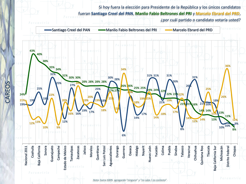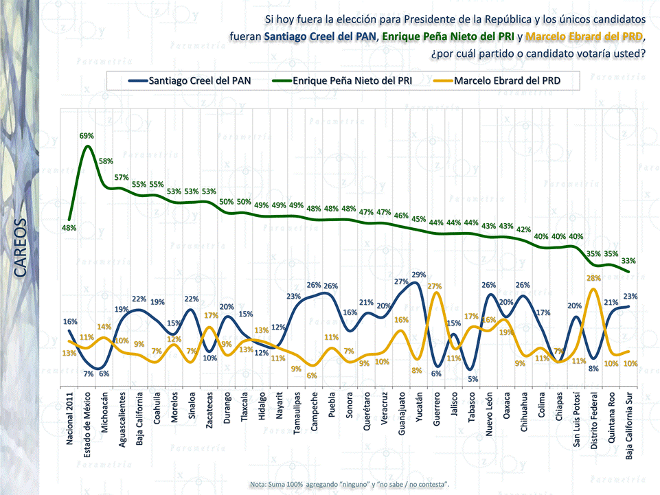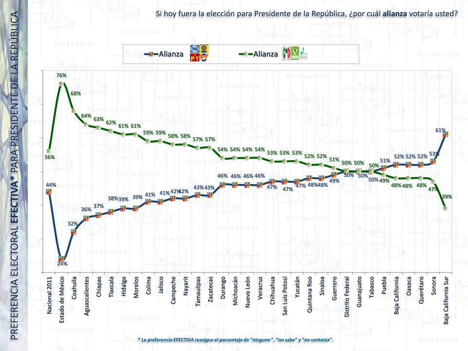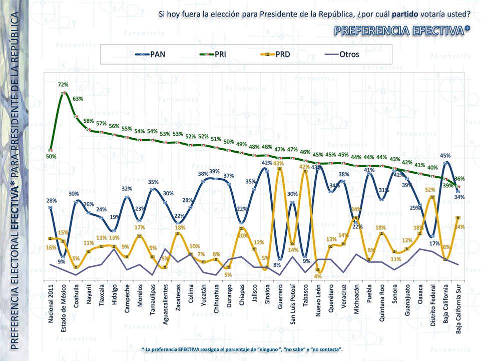 A nivel nacional y sin alianzas el PRI tiene 50% de preferencia efectiva, frente al 28% del PAN y 16% del PRD. Es en el Estado de México donde el PRI tiene mayor ventaja frente al resto de los partidos con 72% (su más cercano competidor es el PRD con apenas 15% en la entidad y con una PAN que no llega a los 10 puntos porcentuales). Se observa que de las 32 entidades únicamente Baja California no sería ganada por el PRI, superado en 6 puntos por el PAN. Solamente Guerrero, Tabasco, Puebla, Guanajuato, Nuevo León, Baja California Sur y Sonora presentan escenarios de elección competida. Los partidos emergentes (PT, Verde, Convergencia y Nueva Alianza) suman 6%.