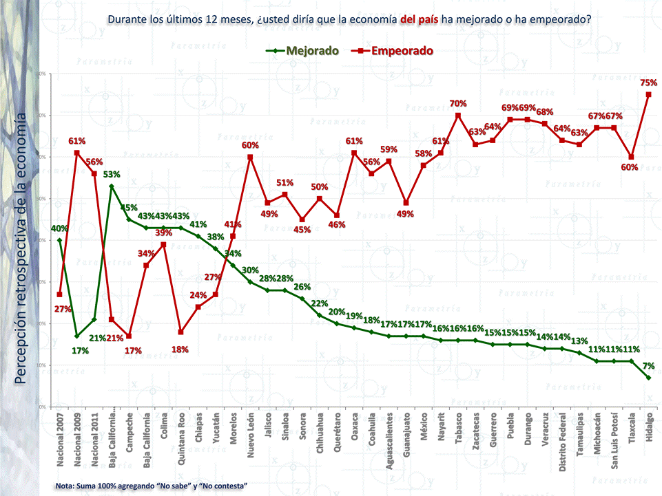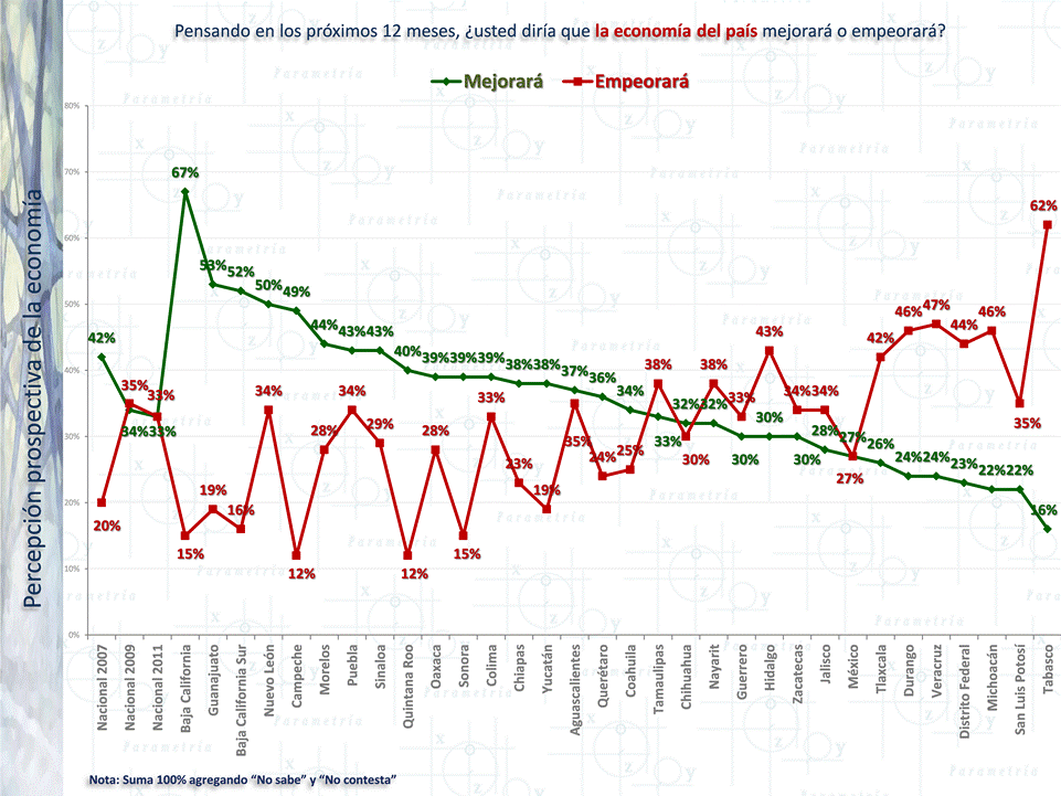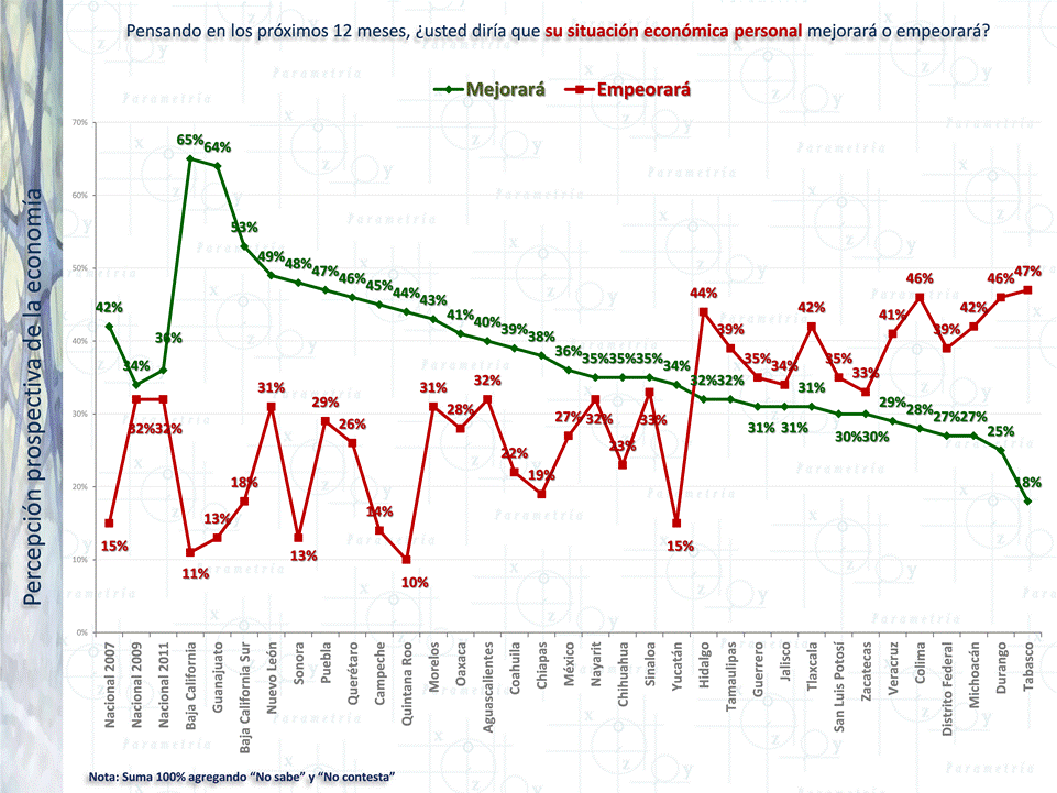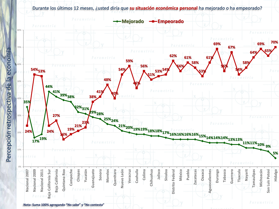 Los resultados del Parámetro estatal 32 muestran que, actualmente 53% de los mexicanos opina que su situación económica personal ha empeorado en los últimos 12 meses; al considerar el panorama del próximo año el porcentaje baja 21 puntos, siendo el 32% los que creen que empeorará y 36% los que ven mejora.