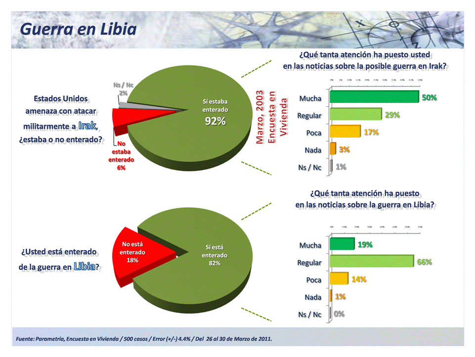 El nivel de conocimiento sobre los eventos anteriores que han ocurrido en los países de Medio Oriente es considerable. En 2003 el 92% de mexicanos se enteraron de la amenaza de EEUU para atacar militarmente a Irak, donde además el 79% de los entrevistados reportó haber puesto regular o mucha atención a las noticias sobre el evento. Para el 2011, la Encuesta Nacional en Vivienda de Parametría realizada en marzo, arrojó datos interesantes sobre la percepción de los mexicanos en los temas de la guerra, y cómo estos han cambiado desde la guerra en Irak.