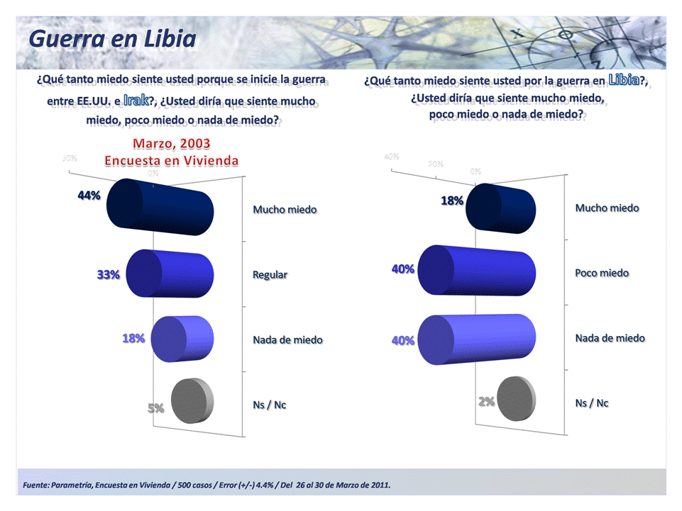 Ante cualquier evento bélico, el miedo es uno de los sentimientos latentes experimentado por las personas. En 2003 el 44% de los mexicanos dijo tener mucho miedo de iniciarse la guerra entre EEUU e Irak, y sólo el 18% refirió no tener nada de miedo. La guerra en Libia parece representar una menor amenaza para los mexicanos: 80% dijo tener poco o nada miedo ante este evento.