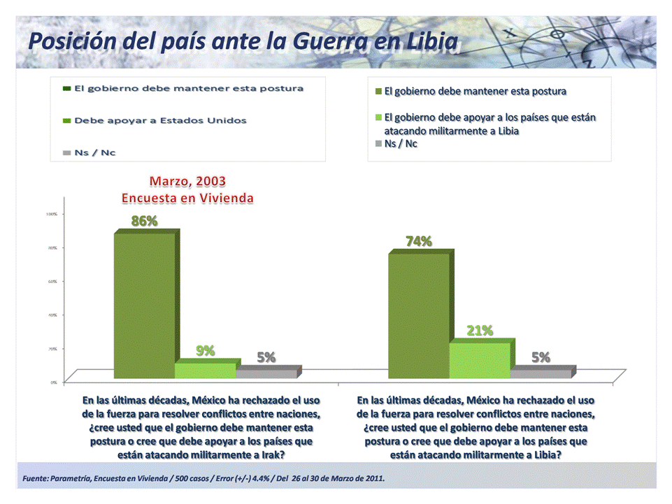 Para el caso de la guerra en Libia, el 74% se inclinó por mantener una posición pacifista para resolver el conflicto, contra un 21% que consideró que el país debe apoyar a los países que están atacando militarmente a Libia. Hay una baja de doce puntos respecto a la postura de que México rechace el uso de la fuera para resolver conflictos entre naciones y hay mayores menciones para apoyar a los países que están atacando Libia.