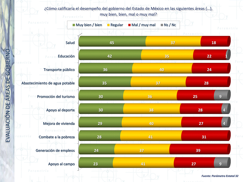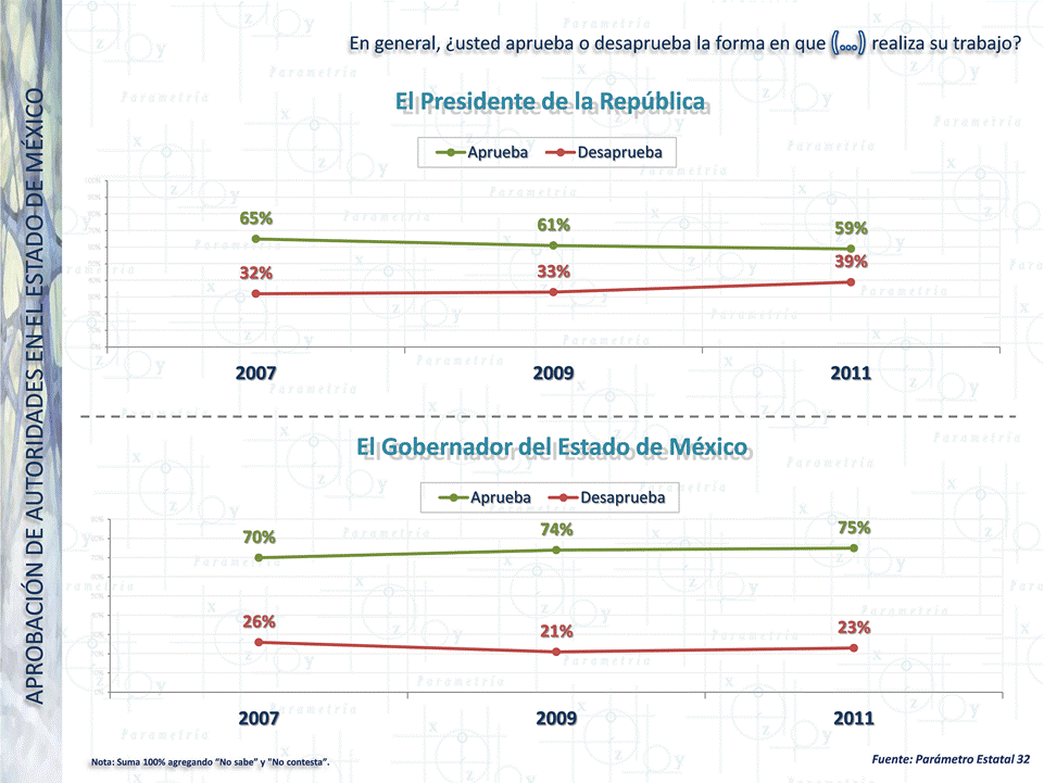 Los números de Parametría muestran que, evaluado como gobernador, la gestión de Peña Nieto alcanza el 75% de aprobación entre los mexiquenses, en cambio la evaluación del Presidente Felipe Calderón entre los ciudadanos del Estado de México es menor en 16 puntos que la del mandatario estatal.