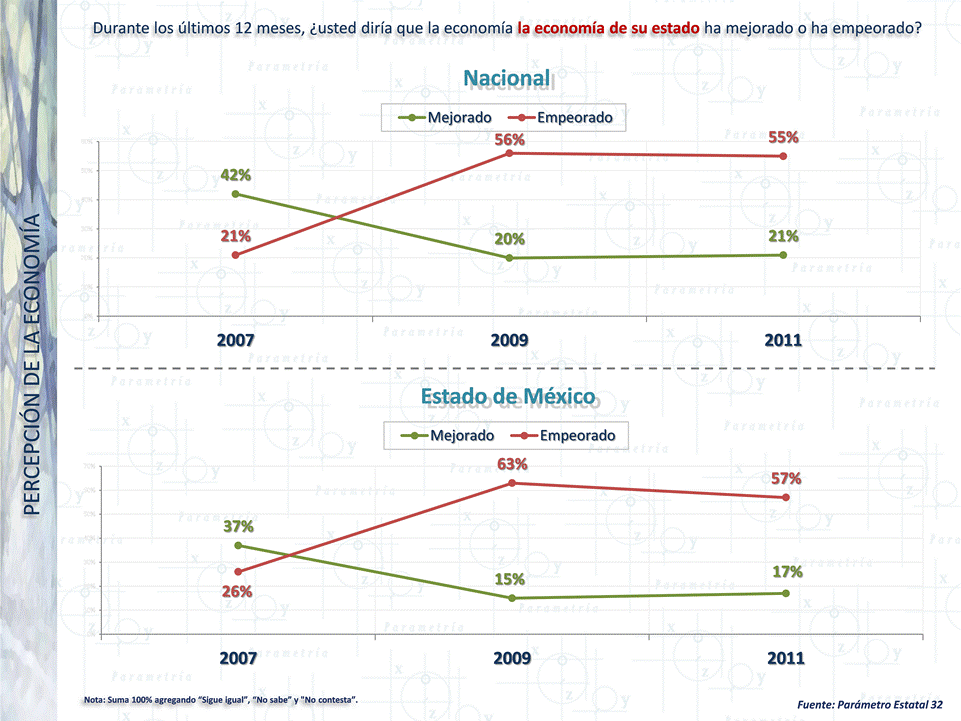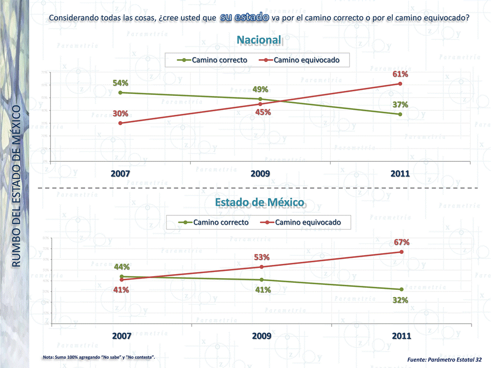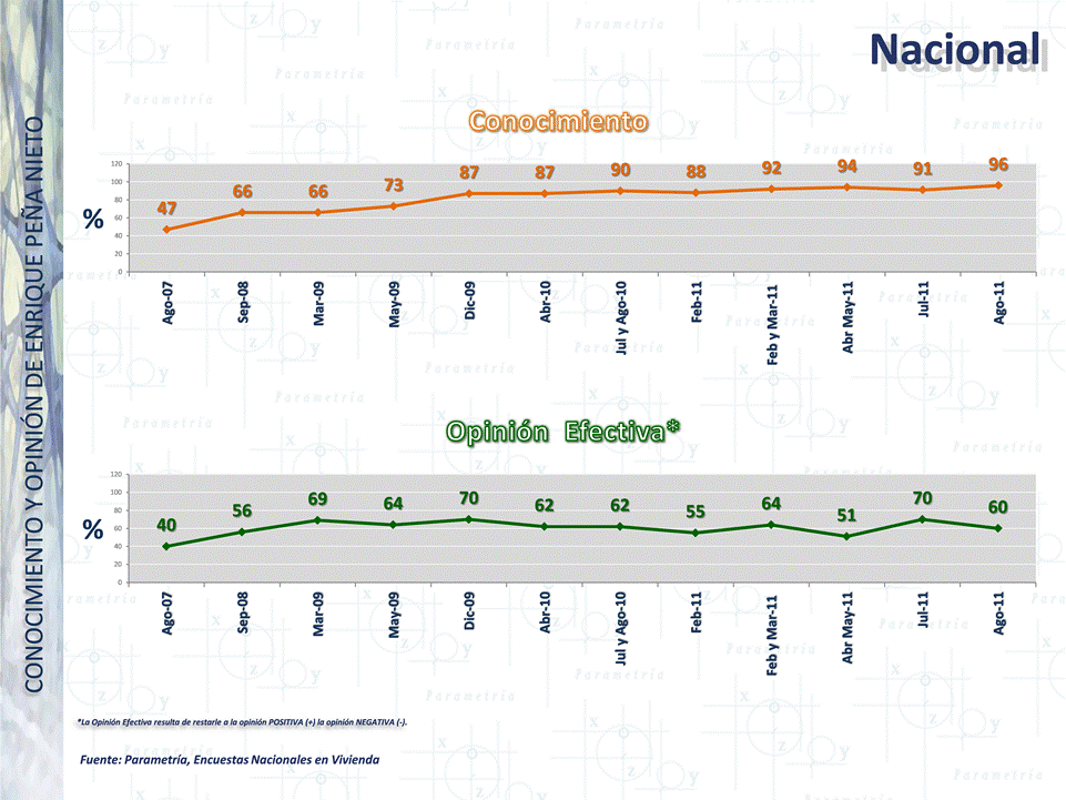 PARAMETRÍA. Estudio: Encuesta Nacional en vivienda. Representatividad: Nacional. Número de entrevistas: 12,800 casos, junio de 2011. Nivel de confianza estadística: 95%. Margen de error (+/-) 0.9%. Diseño, muestreo, operativo de campo y análisis: Parametría SA de CV. Método de muestreo: Aleatorio sistemático con probabilidad proporcional al tamaño. Unidad de muestreo: Las secciones electorales reportadas por el IFE.