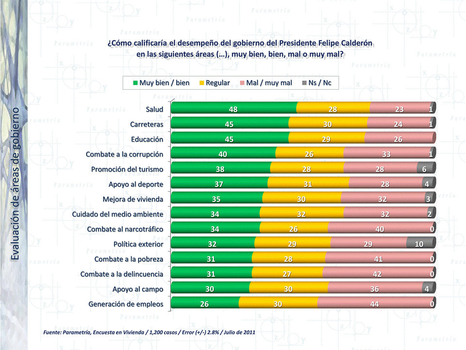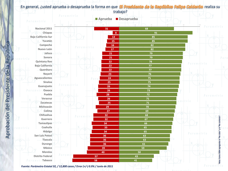 PARAMETRÍA. Estudio: Encuesta Nacional en vivienda. Representatividad: Nacional. Número de entrevistas: 1000 casos del 23 al 28 de julio de 2011. Nivel de confianza estadística: 95%. Margen de error (+/-) 3.1%. Diseño, muestreo, operativo de campo y análisis: Parametría SA de CV. Método de muestreo: Aleatorio sistemático con probabilidad proporcional al tamaño. Unidad de muestreo: Las secciones electorales reportadas por el IFE.